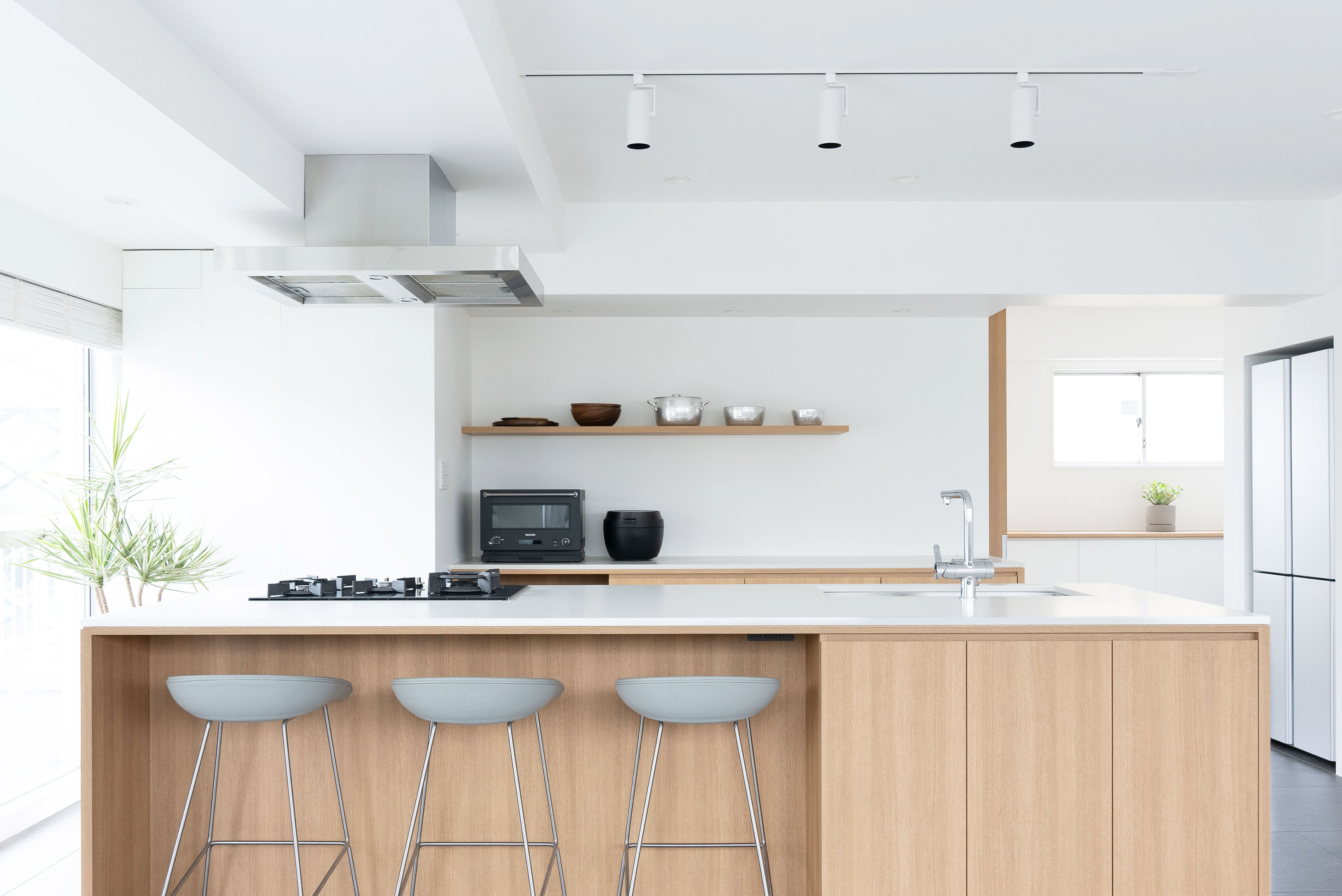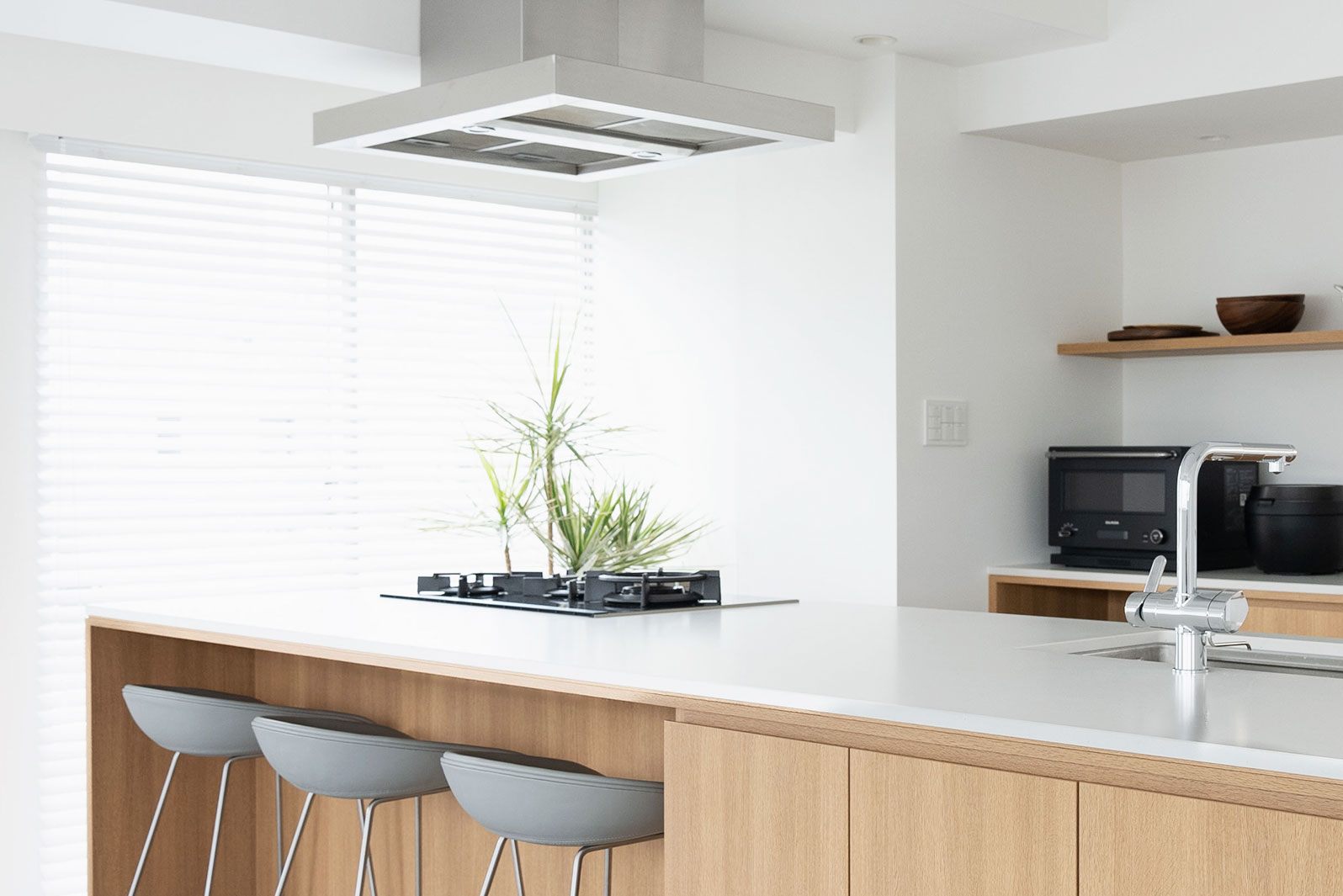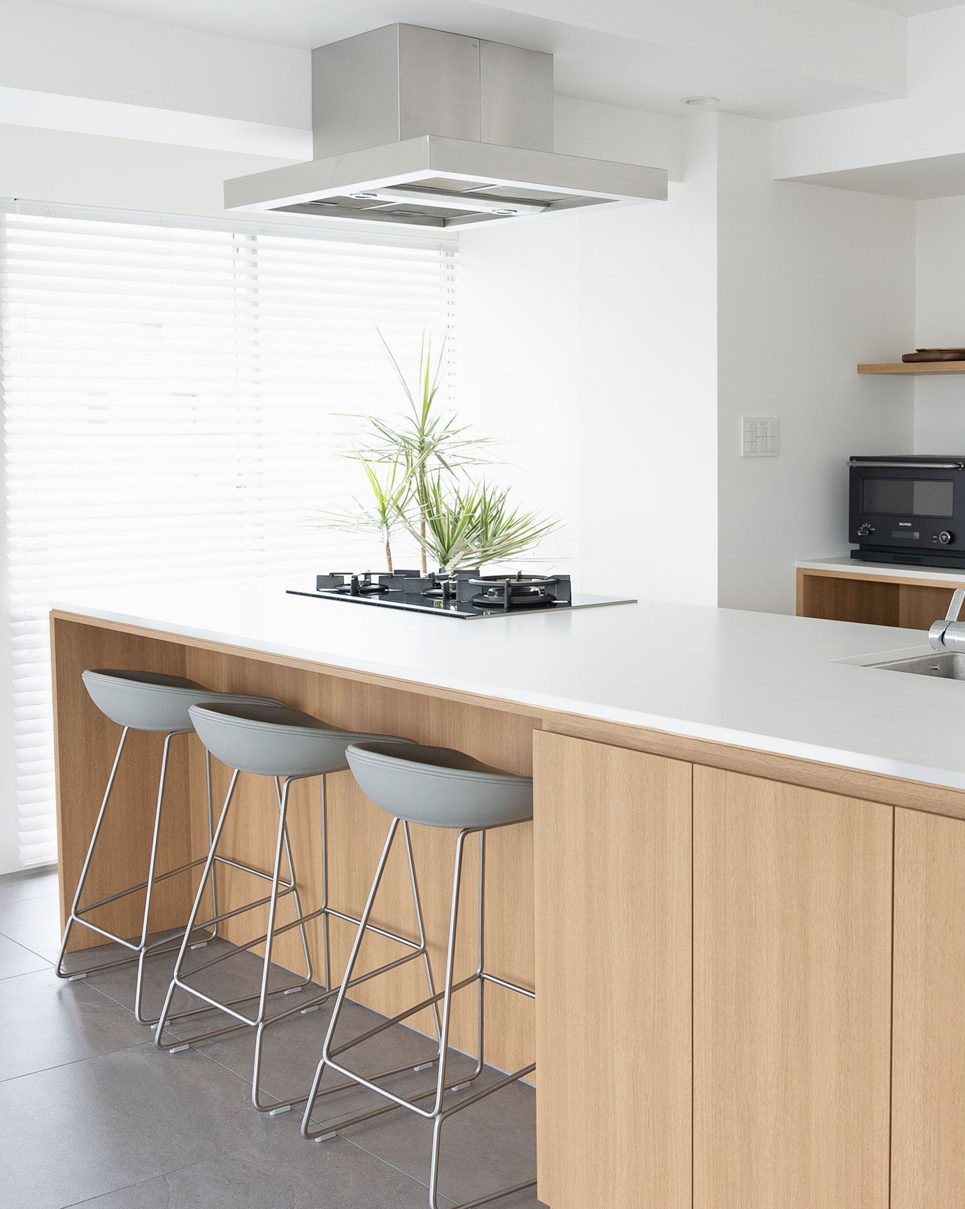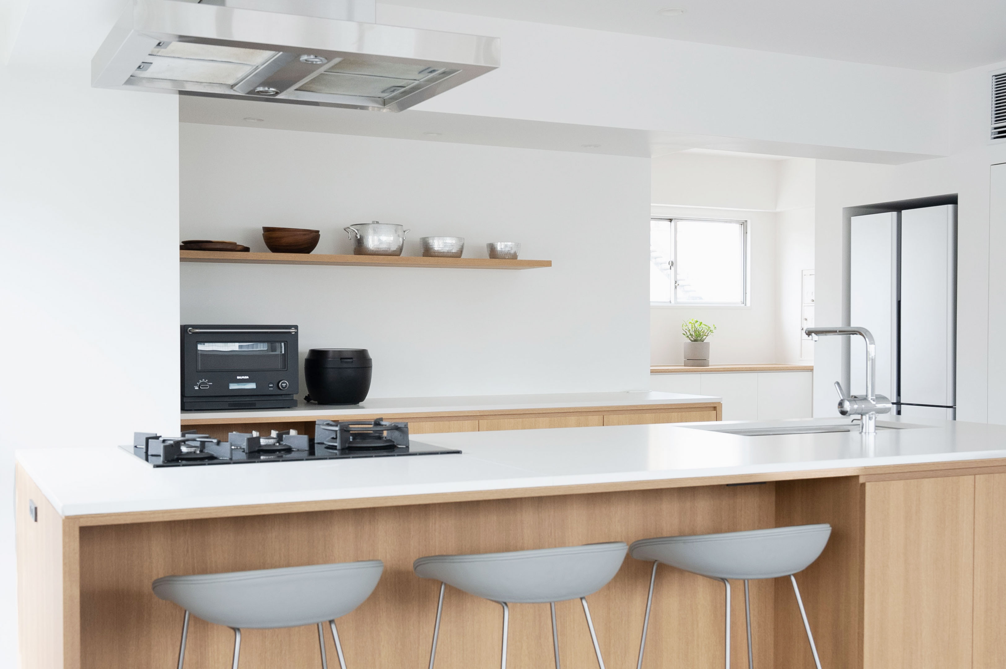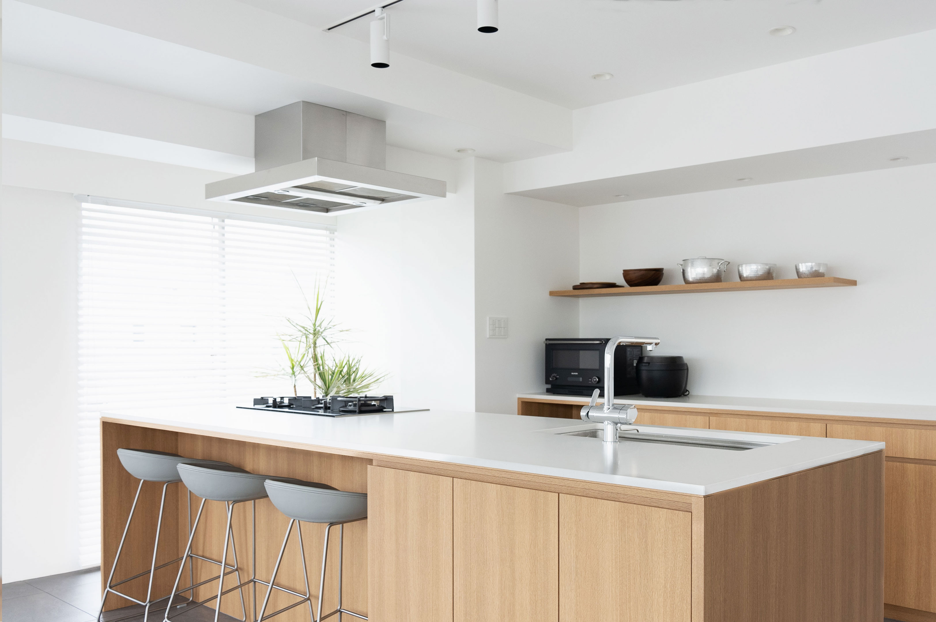 洗練されたデザインのアイランドキッチンがあるスペースのほか、